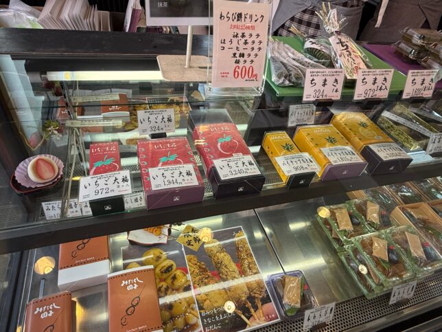 店内に入りました。いちご大福・パイナップル大福・みたらし団子が並んでいます。いちご大福とパイナップル大福が同じスペースでアピールしているの珍しいですね。というか、パイナップル大福見たの初めてかも。