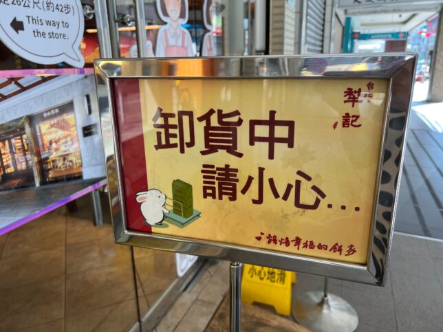 看板には卸貨中 請小心と書いてあり、卸売なのかしら?とか思ったのですが、荷下ろし中(卸貨中)、 請小心(ご注意ください)という意味でした。左下でウサギが荷物運んでいるのも、そういう意味だったのね。