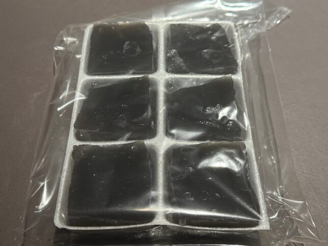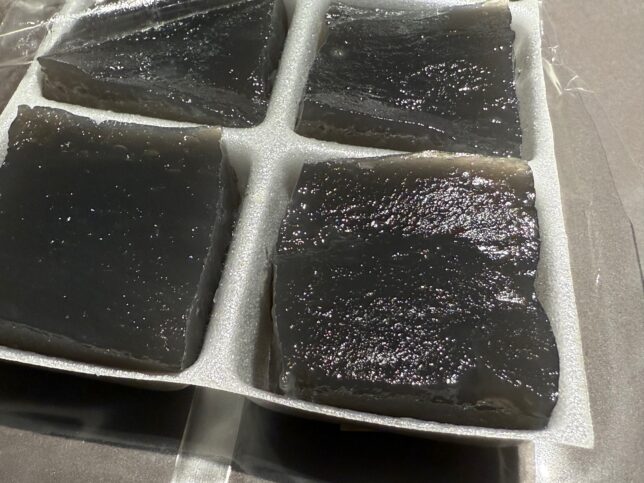 中には説明紙・黄粉・そして和三盆糖がついてました。和三盆糖付いてくるのは初めて買ったかも。 わらび餅をアップでどうぞ。高級な蕨粉を手練りしてあるので、もちもち感が凄い。黄粉・和三盆糖をつけずにそのままつけても、ほのかな甘みがあって美味しいです。すごいな、これ。
