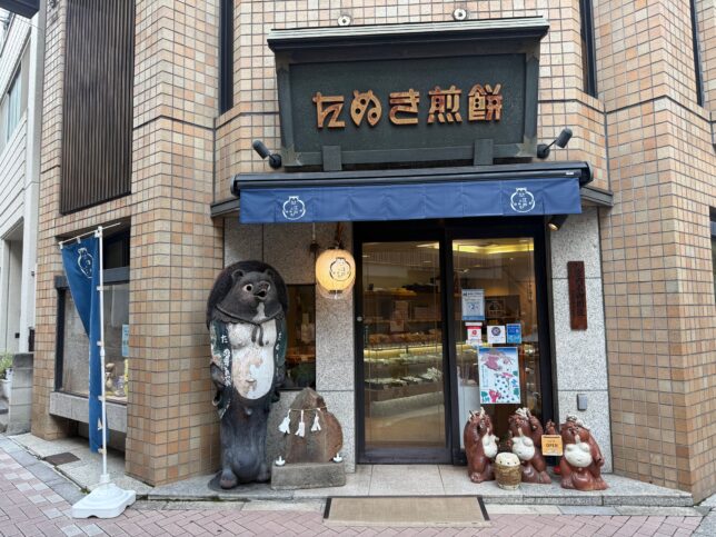 という、たぬき煎餅さんの外観です。入口では店名でもあるタヌキ達が出迎えてくれます。
