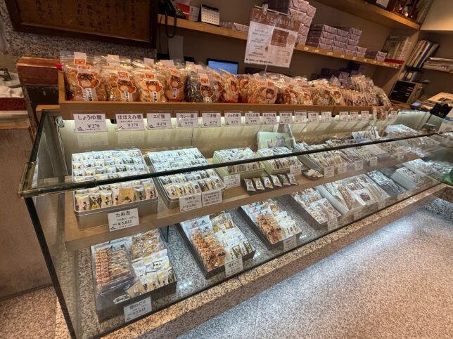 店内に入りました。せんべいがズラリと並んでいます。都内にあるせんべい店の中では、圧倒的に種類が多い部類なのではないかと。