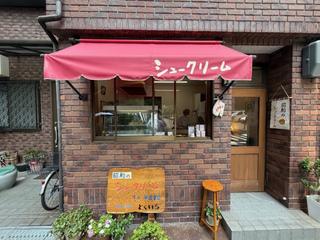 という、とくいちさんの外観です。個人宅の一角のようなスペースですが、結構な勢いでお客さんがやってくる人気店です。所々に書かれた「昭和のシュークリーム」の文字に心躍りますね。
