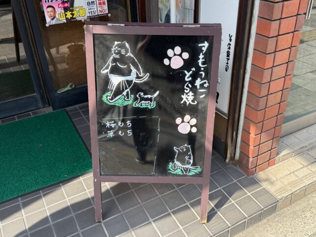 店頭には「すもうねこどら焼」の看板が。漫画家・はすまるさんの4コマ漫画・すもうねことコラボしたどら焼きを2011年から販売されているのです。
