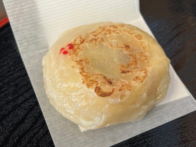 と、物色をしたのちに、入り口で頼んだおやきが焼き上がったので受け取ります。もちろん、ねぎ味噌チーズおやきです。