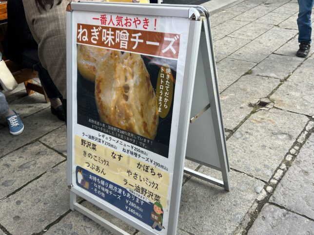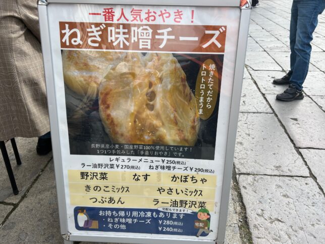 こちら、店頭の看板です。おやきの一番人気は「ねぎ味噌チーズ」。組み合わせからして絶対美味しいやつやん。