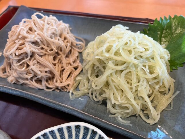 ということで、オーダーしました。右が一般的なお蕎麦、右側が青じぞ切りとなります。
