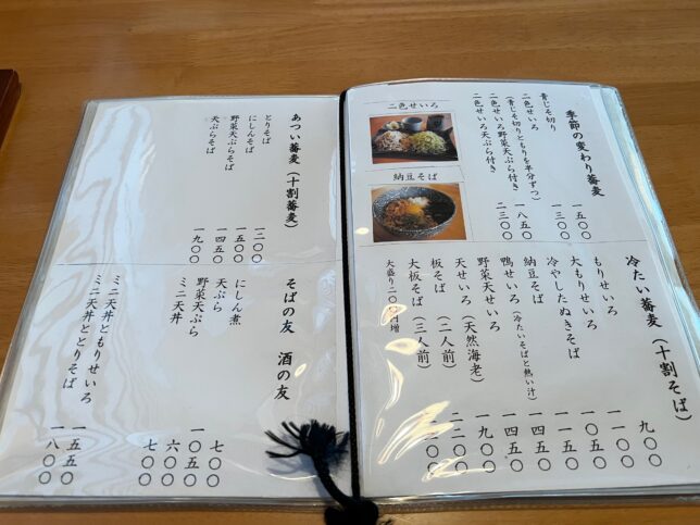 こちらがメニューです。看板商品は季節の変わり蕎麦が入った、二色せいろです。