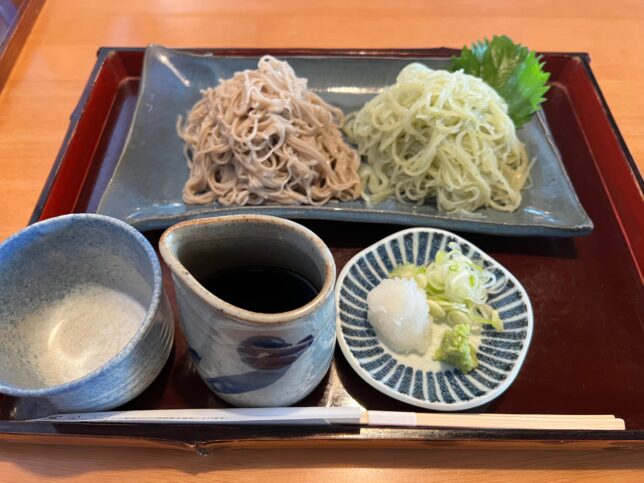 ということで、オーダーしました。右が一般的なお蕎麦、右側が青じぞ切りとなります。