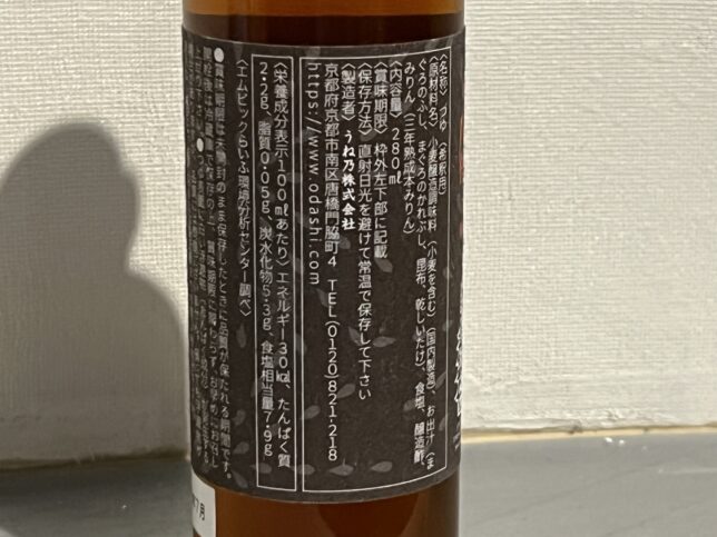 こちらが原材料です。マグロ節・昆布・しいたけがメインで、3年熟成の本みりんも入っていますね。