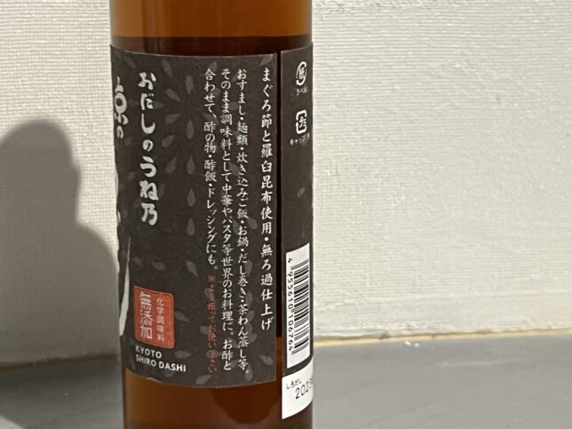 という、うね乃さんの 京のしろだし 10倍希釈タイプを購入しました。ラベルをアップで。右下に無添加と書かれていますね。