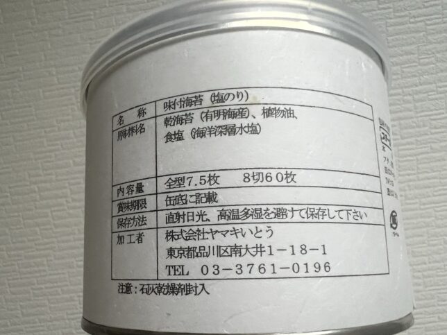パッケージ裏側です。有明海産の海苔・植物油・食塩(海洋深層水塩)のみです。