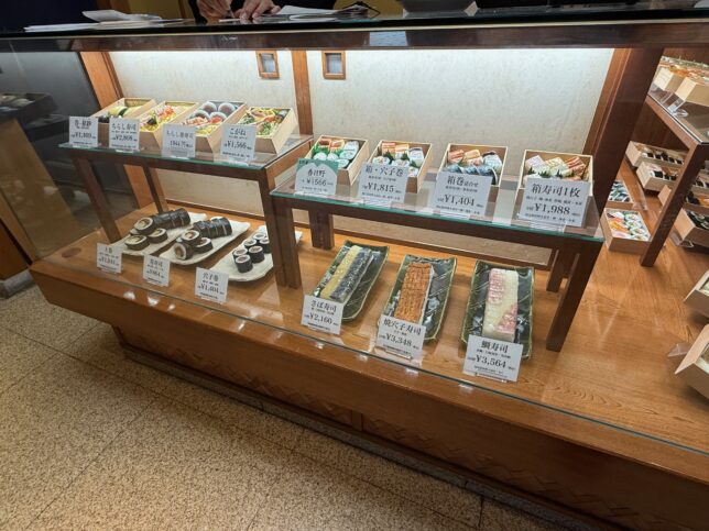 店内に入りました。押し寿司・まき寿司・ちらし寿司・棒寿司が並んでいます。様々な組み合わせのセットがありますよ。