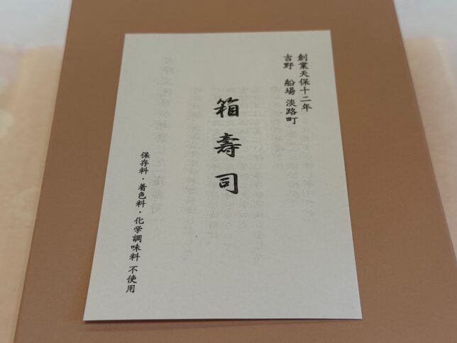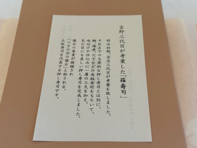 裏面です。吉野三代目が考案した「箱寿司」から始まります。懐石の要素が凝縮されていると称されるのが凄いですね。初めて見た人はきっと衝撃を受けたに違いない。