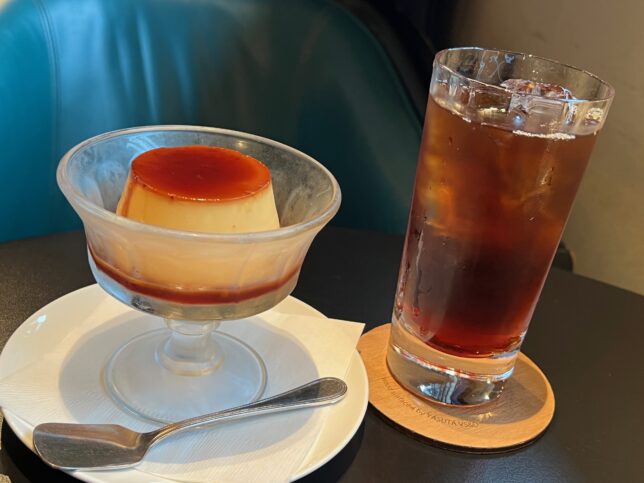 で、今回はプリンとサマーブレンドをオーダー。後ろのソファーの色味がめっちゃ好み。