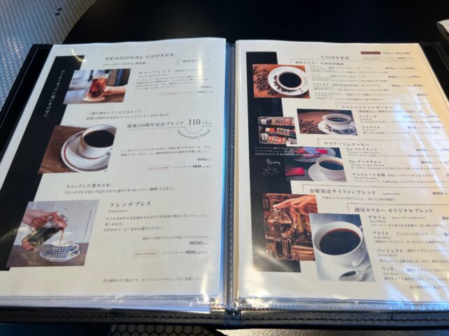 そして、コーヒーです。季節のブレンド・110年記念ブレンド・フレンチプレスなどなど、こだわりが垣間見えるメニュー構成でとても良い。