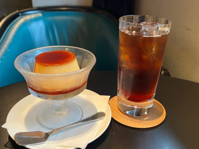 で、今回はプリンとサマーブレンドをオーダー。後ろのソファーの色味がめっちゃ好み。