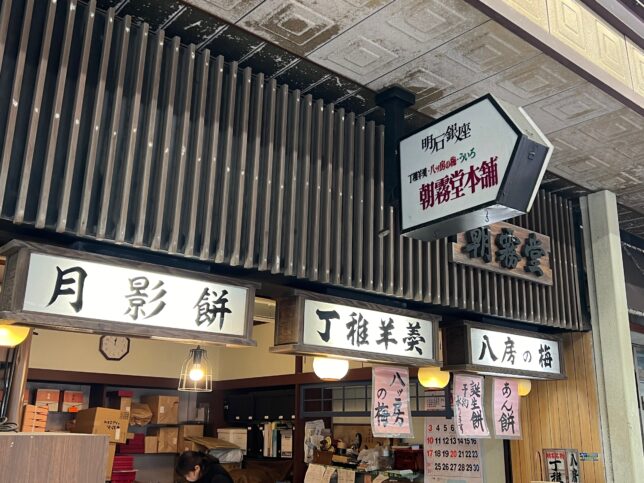 JR/山陽・明石駅から徒歩7分ほど、明石銀座商店街の銀座通り沿いに店を構える 朝霧堂。1913年(大正2年)創業の老舗和菓子店で、求肥に梅肉を練り込んだ銘菓「八房の梅」や、粒あんを包んで焼く「あんもち」など、餅のおいしさが際立つ品で知られます。添加物を一切使っていないことを軸とした丁寧なお菓子作りが定評のあるお店ですが、2025年3月に隣店からの延焼でお店が全焼し現在は再建に向けて活動中です。2026年4月の再開を目指されているとのこと。