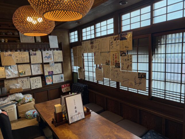 店内の様子です。この小上がりの席に案内されましたが、壁側・窓側にサインが複数飾られていました。