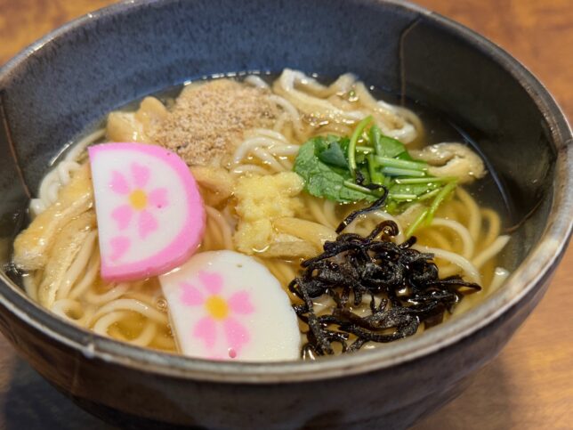 ということで、ささめうどんです。細めのうどんに、あんかけっぽい出汁がかかっています。具材はすりごま・きざみあげ・かまぼこ・三つ葉・塩こんぶ・おろし生姜が乗っています。豪華や。