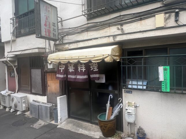 大崎警察署前のバス停から徒歩2分ほど、池上線・大崎広小路駅から徒歩5分ほど、細い小道を抜けた階段上に店舗を構える 平和軒。1927年(昭和2年)、どこかの中華街でレシピを習ったとされる初代が、目黒駅周辺で創業しました。屋号の平和軒は、初代の名前の「平」と新元号であった昭和の「和」を組み合わせて生まれた名前だそう。戦時中に店舗が焼失し、五反田駅前で屋台店として再開。1950年ごろ五反田新開地の一角でオープンし、1965年に現在の店舗へと移転され、店舗兼住居となりました。現在は3代目の小林博明氏によって運営されています。