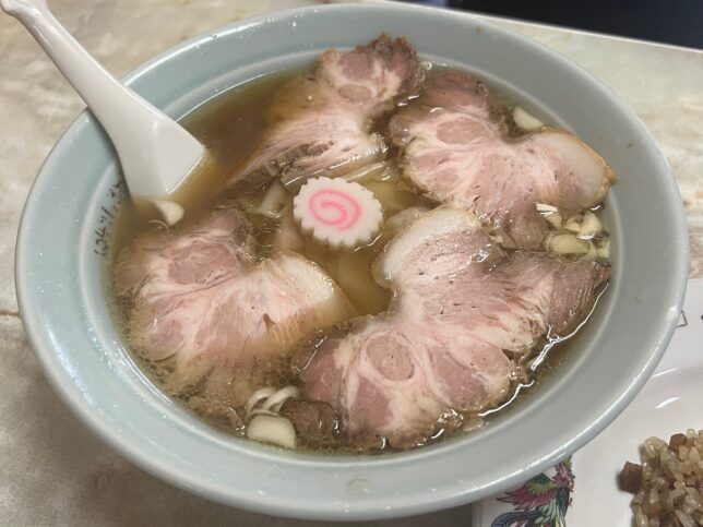 こちらがチャーシューメンです。肉が柔らかくって美味しかった。ちぢれ気味の麺も昔ながら感があって大変良い。