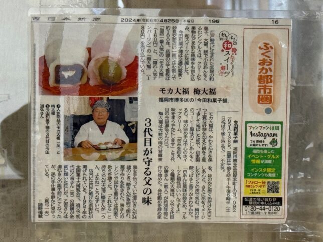 吉塚駅東口のバス停から徒歩2分ほど、JR吉塚駅から徒歩4分ほどの場所、妙見交差点の角にある 今田和菓子舗。正確な創業年はわからないそうですが、大正時代に初代・今田乙吉さんが開業した和菓子店です。現在は3代目・今田道弘さんがそのお菓子作りを引き継がれています。モカ大福・梅大福や季節のお菓子が人気とのこと。交通の要所である妙見交差点で街の発展を共にしてきた和菓子店となります。