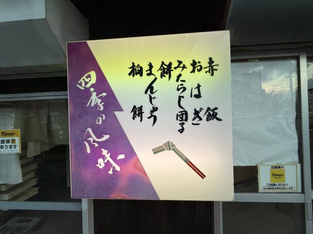 入り口の看板です。赤飯・おはぎ・みたらし団子・餅・饅頭・柏餅とあります。四季の風味を推してくれるのが昔ながらの和菓子店で良いですね。