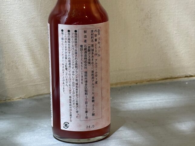 ラベル後ろ側です。高級ブランド苺「博多あまおう」を贅沢に使ったフルーツ・スパークリングです、と書かれています。