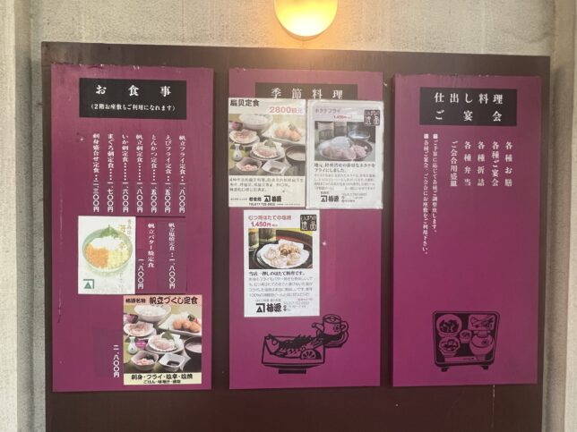 こちらが訪問時のメニュー表です。名物の帆立メニューがめちゃくちゃ沢山ある。