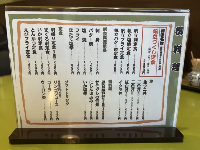 こちらがメニュー表。帆立を中心に各種定食が揃っております。