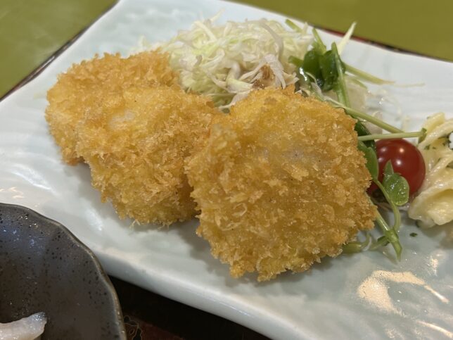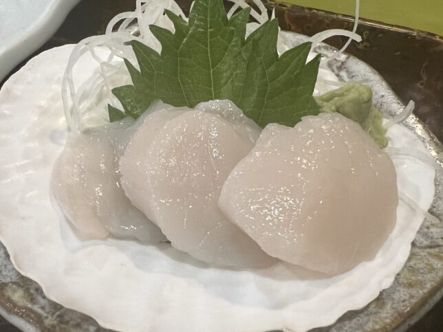 で、今回は帆立づくし定食をオーダーしました。刺身・フライ・塩辛・塩焼きと4種類ついています。豪華…!