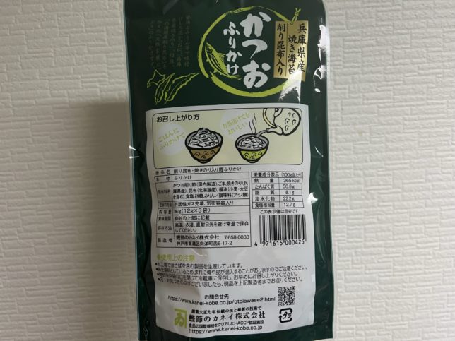 という、カネイさんの「かつおふりかけ」を購入しました。兵庫県産焼き海苔・削り昆布入りです。