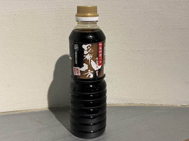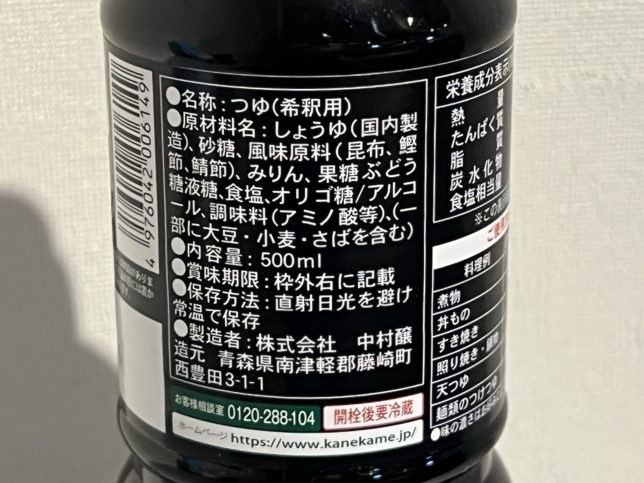 ラベル裏側です。原材料名は醤油・砂糖・風味原料(昆布・鰹節・鯖節)・みりん・果糖ぶどう糖液糖など。麺つゆなので出汁比率が上がってますね。
