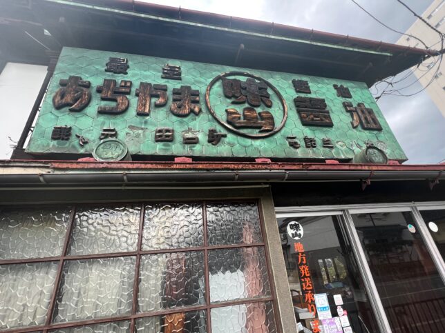 という、河田醤油醸造場さんの外観です。年季の入った看板が素晴らしいですね。あぢやまは味山から来た屋号だったのね。