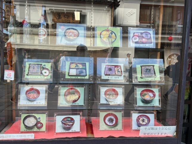 店頭のディスプレイではメニューが確認できます。蕎麦屋さんですが、うどんに変更も可能です。観光地ですからね。