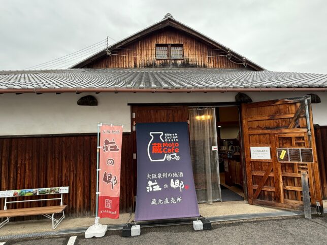 という北庄司酒造店さんの外観です。ライダーズ & サイクリストスポット 蔵MotoCafeの名で売店を営業されています。