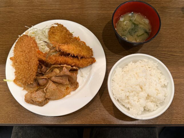 この贅沢しすぎた一皿を是非ご覧ください。しょうが焼もハムカツも、そして名古屋生まれとして外せないエビフライも、と欲張るとこうなります。全部が全部最高でございました。