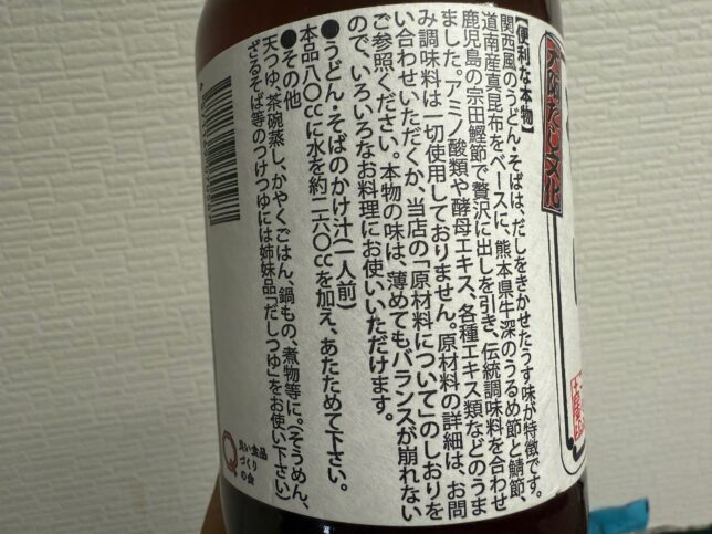 希釈用の商品で、原材料は丸大豆醤油・租糖・さば節・うるめ節・塩・宗田鰹節・真昆布・純米酒・伝統味醂とこだわりが凄い。
