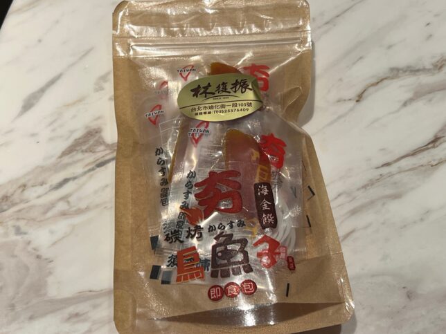 今回すでにカラスミの大きいのを同じ迪化街の永久號さんで購入していたため、おつまみっぽく食べられそうな一口サイズ商品を買いました。これ日持ちするし、美味しいし分けやすいし、想像以上に良かった。カラスミってプレゼントされることないから、驚いてもらえるのも新鮮だった。こういうお土産も良いねぇ。