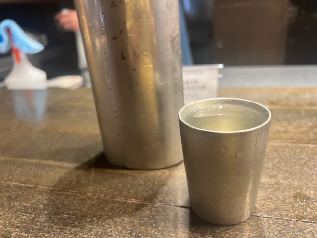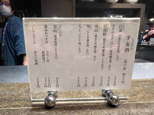 で、隣の立ち飲みコーナーに行きます。え、白金あるじゃない。山廃仕込みの純米酒になります。1杯350円はかなりリーズナブル。