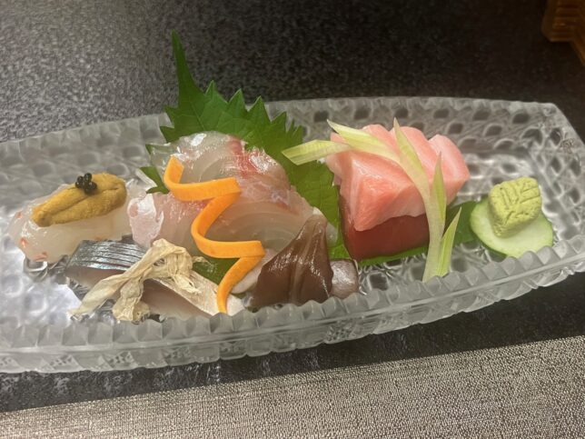 そしてお刺身です。ワサビが木の葉型になっててカワユイ。