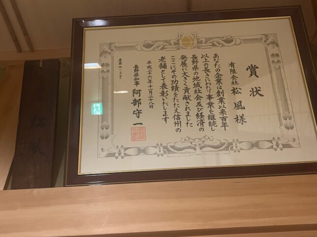 帰り際、入り口に「信州の老舗」の表彰状のようなものが飾られていました。信州の老舗ももっと攻めたいなぁ。