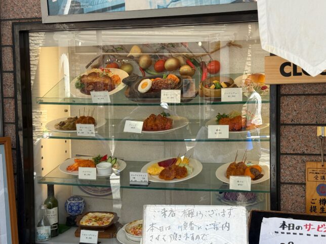 こちらがディスプレイです。名物のオムライスと串カツを食べに来たのですが、ポークチャップとハンバーグに心を奪われました。