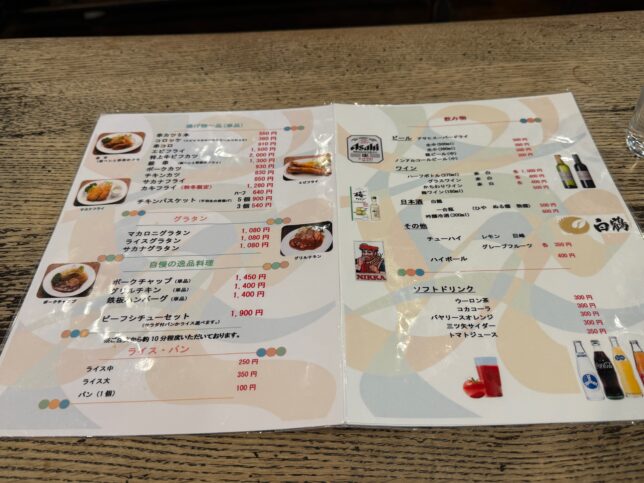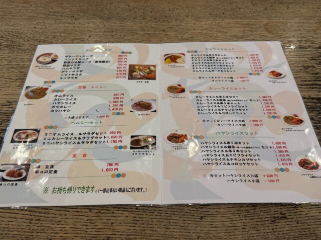店内に入ります。セット系メニューが充実しており、オムライス・カレー・ハヤシライスを軸に、串カツ・エビフライ・チキンカツ・コロッケ・ポークカツと合わせることができます。