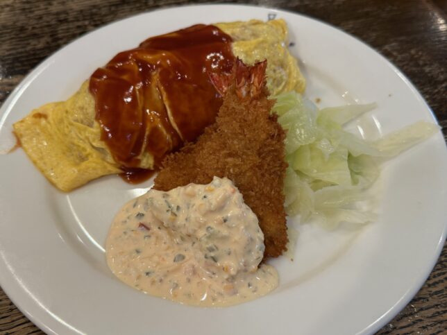 オムライス&エビフライです。エビフライは、珍しい海老を開いたタイプ。ぷりぷり食感は犠牲になっている気もしつつ、エビの旨みがギュッとやってくる感じもあり、このスタイルもとても良い。オムライスは卵の半熟具合と、水分多めのリゾット的なご飯の組み合わせが口当たり優しく美味しかった。