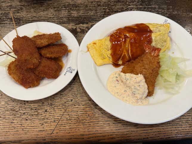 オムライスと串カツのセットにすれば良いな、と元々考えていたのですが、エビフライも食べたくなり、オムライス&エビフライセット、プラスで串カツを頼む豪華目なランチにしました。