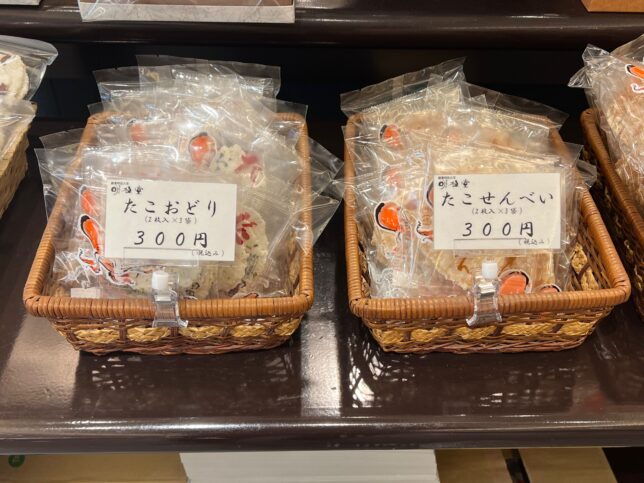 たこを使ったお菓子も沢山あります。こちらはたこおどりと、たこせんべいです。