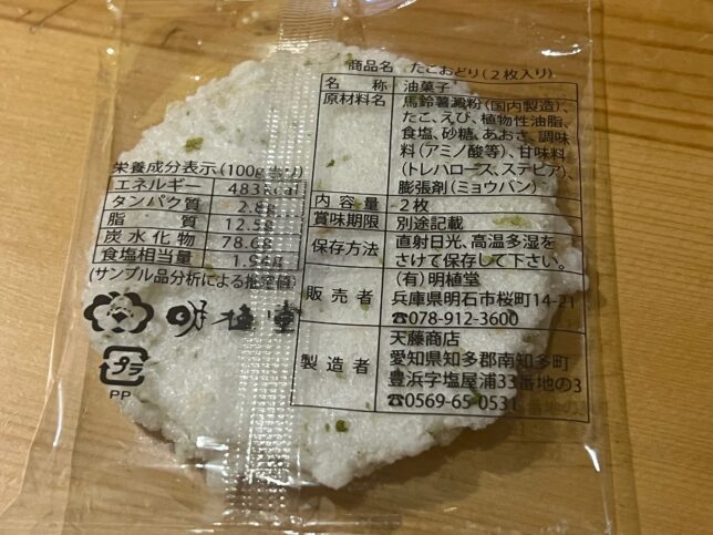 裏側の原材料です。名称は油菓子となっていて、馬鈴薯の粉・たこ・えび・あおさ等が入っています。