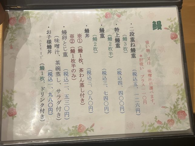 店内に入りました。こちらが鰻のメニュー表です。鰻卵とじ重とか、今更気になっている。