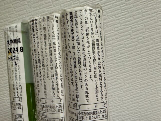 パッケージ上部をアップで。「とびきりうまいそば」から名付けられたとのこと。国内製造の小麦粉、蕎麦粉に山芋が入っているのが特徴です。